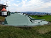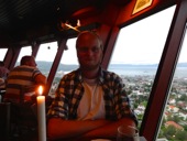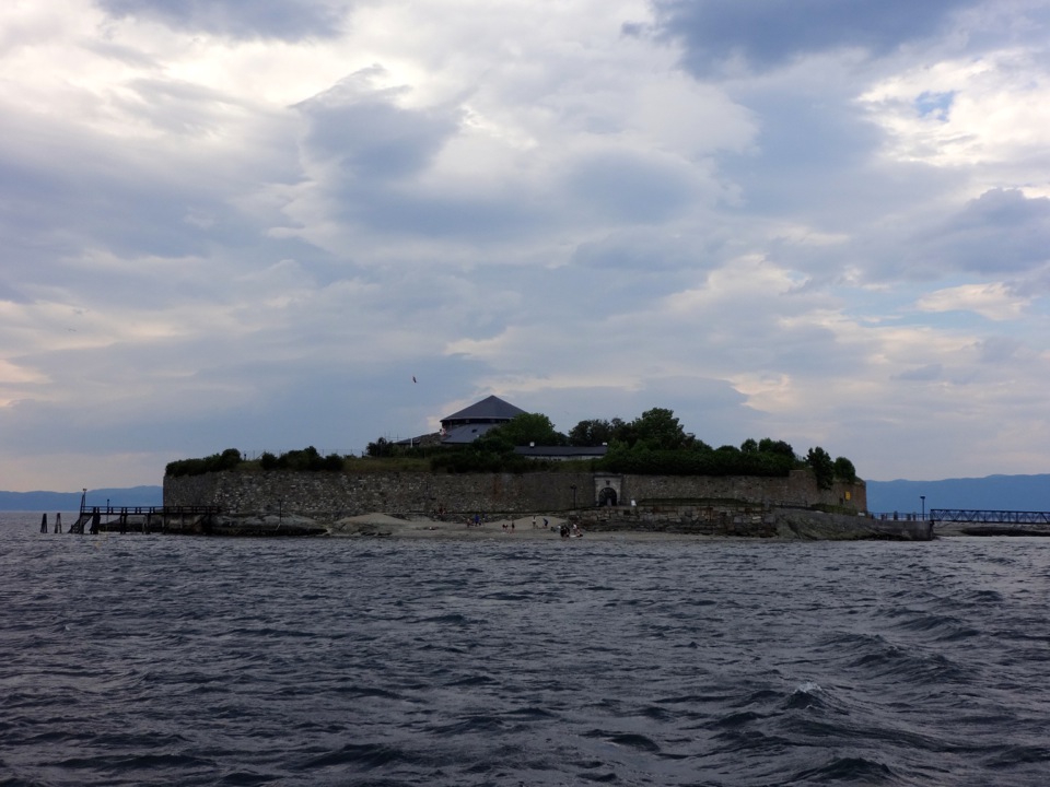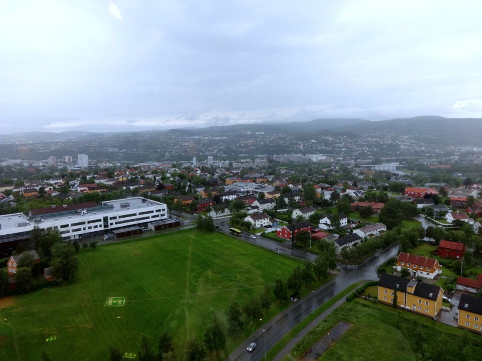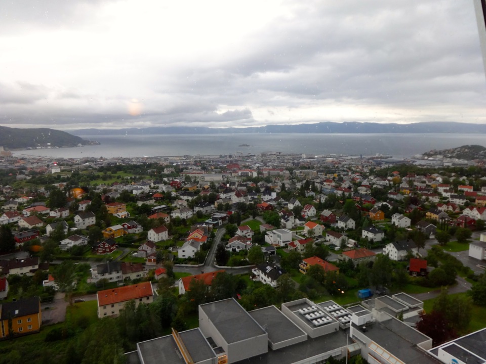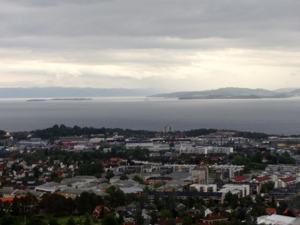 Dafür gab es dann am 3. Tag etwas gemütlicheres. Wir sind zusammen auf die Insel Munkholmen gefahren. Da wollte ich ja auch sowieso mal hin. Hatte die Insel bisher ja nur von weitem gesehen. Die Insel ist ganz nett, aber auch unspektakulär. Wir haben aber auch keine Führung gemacht, um das Innere des Gebäudes zu sehen. Es diente auf jeden Fall schon als Abwehranlage sowie als Gefängnis. Umso besser ist es, dass die Insel einen kleinen Sandstrand hat. Dort kann man auch im Fjord Baden gehen. Wir haben das probiert, aber nach ca 30 Sekunden mussten wir wieder raus, da das Wasser extrem kalt ist. Zumindest draußen hatte es aber ca. 28 Grad, wodurch wir uns schnell wieder aufwärmen konnten. An diesem Tag ging auch ein ziemlich heftiger Wind, der auf der Munkholmen, die ja direkt im Fjord liegt, nochmal stärker war als in der Stadt. Schön war es trotzdem. Am Abend sind wir dann im Tyholttårnet (Tyholt Turm) zum Essen gegangen. Dies ist ein Fernsehturm recht nah bei dem Haus wo ich wohne. Dort gibt es oben ein Restaurant dessen Boden sich dreht und man so einen 360° Blick über Trondheim bekommt. Leider hat es an dem Abend ein bisschen geregnet, wodurch die Sicht nicht so optimal war. Trotzdem war es ein schöner Ausblick.
