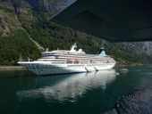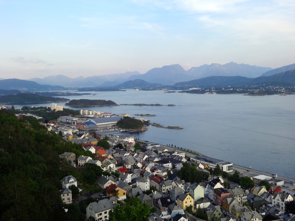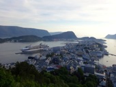 Nach dem Essen ging es ca. 400 Stufen hinauf auf den Hausberg Aksla, von dem man einen super Blick über die Stadt hat. Hier sieht man dann auch, wie verstreut die Stadt auf vielen kleinen Inseln ist. Alle Inseln sind mit Brücken oder Tunnel miteinander verbunden. Es fahren aber auch regelmäßig Fähren hin und her. Da Ålesund direkt am Meer liegt, sind auch viele Kreuzfahrtschiffe im Hafen.