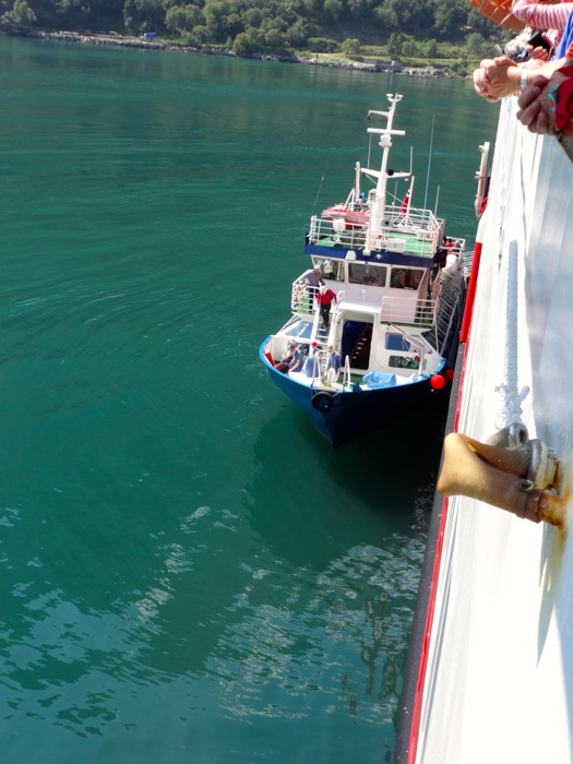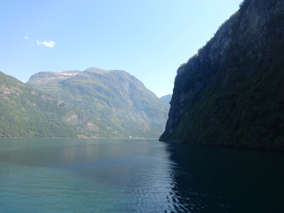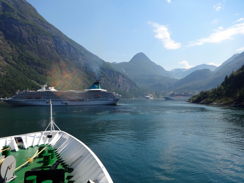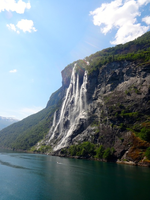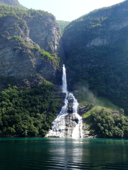 Für uns ging es am nächsten Tag auf die MS Nordnorge, unser Hurtigrutenschiff für die nächsten 23 Stunden. Die Fahrt ging von Ålesund aus in den Geirangerfjord bis nach Geiranger, wieder zurück nach Ålesund und dann weiter nach Trondheim. Der Geirangerfjord ist einer der schönsten Fjorde Norwegens und auch UNESCO Weltkulturerbe. Die Fahrt durch den Fjord ist echt super schön. Links und rechts erheben sich Berge und Klippen mit vielen Wasserfällen und einfach nur schöner Natur. In Geiranger angekommen wurden Passagiere an Land gebracht und neue Passagiere aufgenommen. Dies geschieht über kleine Boote, da die größeren Schiffe nicht direkt anlegen können. Das Hurtigrutenschiff macht nicht lange halt und es ging auch gleich wieder zurück nach Ålesund.