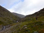Am nächsten Morgen gab es erstmal Frühstück :-). Und das für eine Hütte auch nicht schlecht. Es gab ein Buffet wie in einem Hotel mit Brot, Wurst, Käse, Marmelade, Müsli, Milchreis usw. War richtig gut :-). Um 9 Uhr traf sich die Gruppe dann vor der Tür und es ging auch mal zum Wandern. Der erste Tag sollte einer der längeren werden. Es ging zwar auf keinen Gipfel, aber die Tour bis zur Trollheimshytta dauert so ca. 8 Stunden. Da auch einige betagtere Damen bzw. langsamere Mitwanderer dabei waren, haben wir viele Pausen gemacht und für mich war es nicht so wirklich anstrengend. Ich habe ja seit ich hier in Norwegen bin viel trainiert. Am Anfang war das Wetter noch gut, wurde dann kurz nach der Mittagspause schlechter und es hat auch zum Regnen angefangen. Leider war deswegen die Aussicht nicht ganz so gut. Aber als wir an einem der höchsten Punkte der Tour waren, hat es nicht mehr geregnet und man konnte auch ein bisschen was sehen.